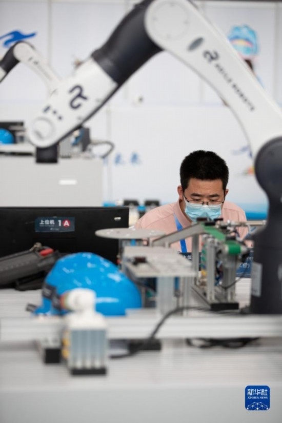 6月6日,選手在進(jìn)行工業(yè)機(jī)器人系統(tǒng)操作員項(xiàng)目比賽。