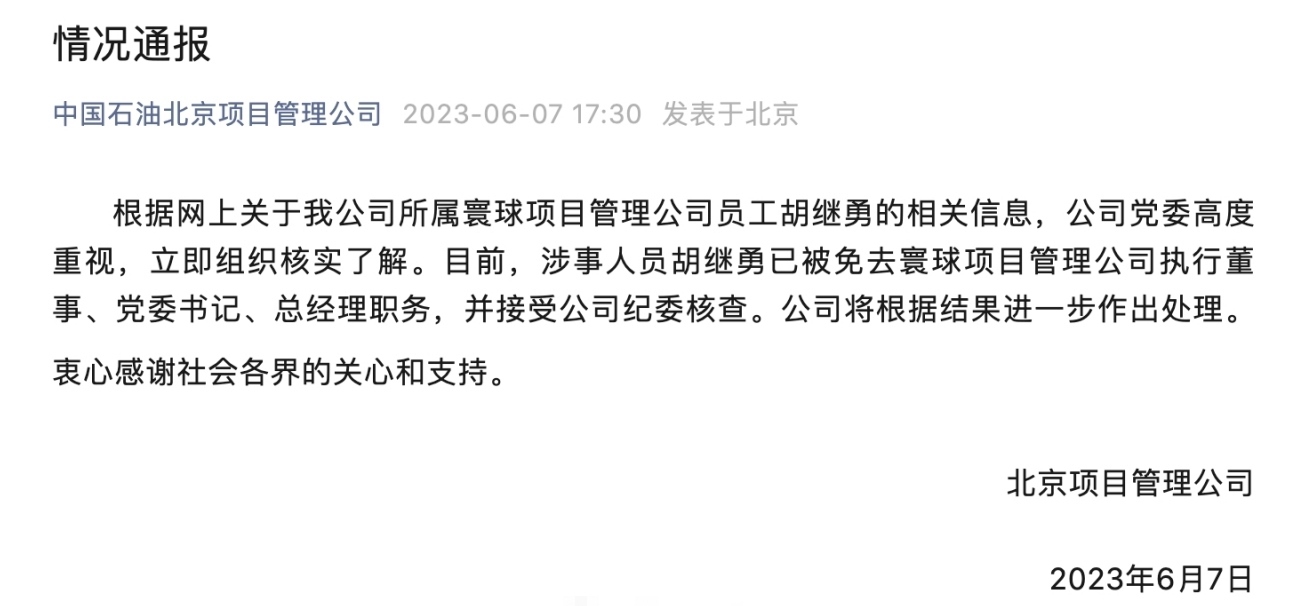 ·國企領導與異性親密牽手逛街被拍,中石油下屬公司回應:已免職。