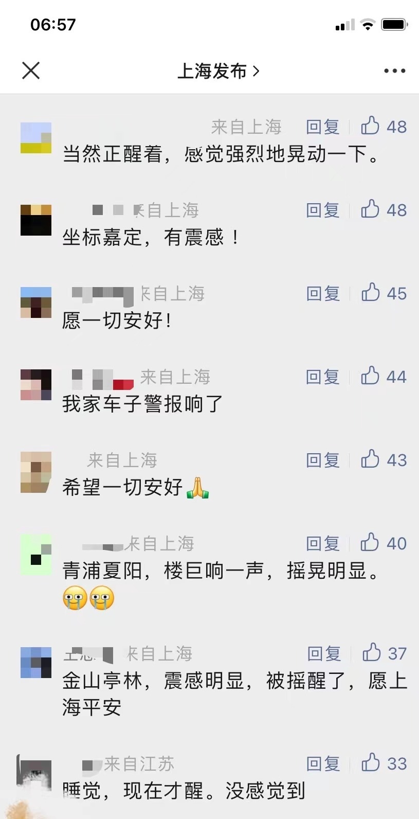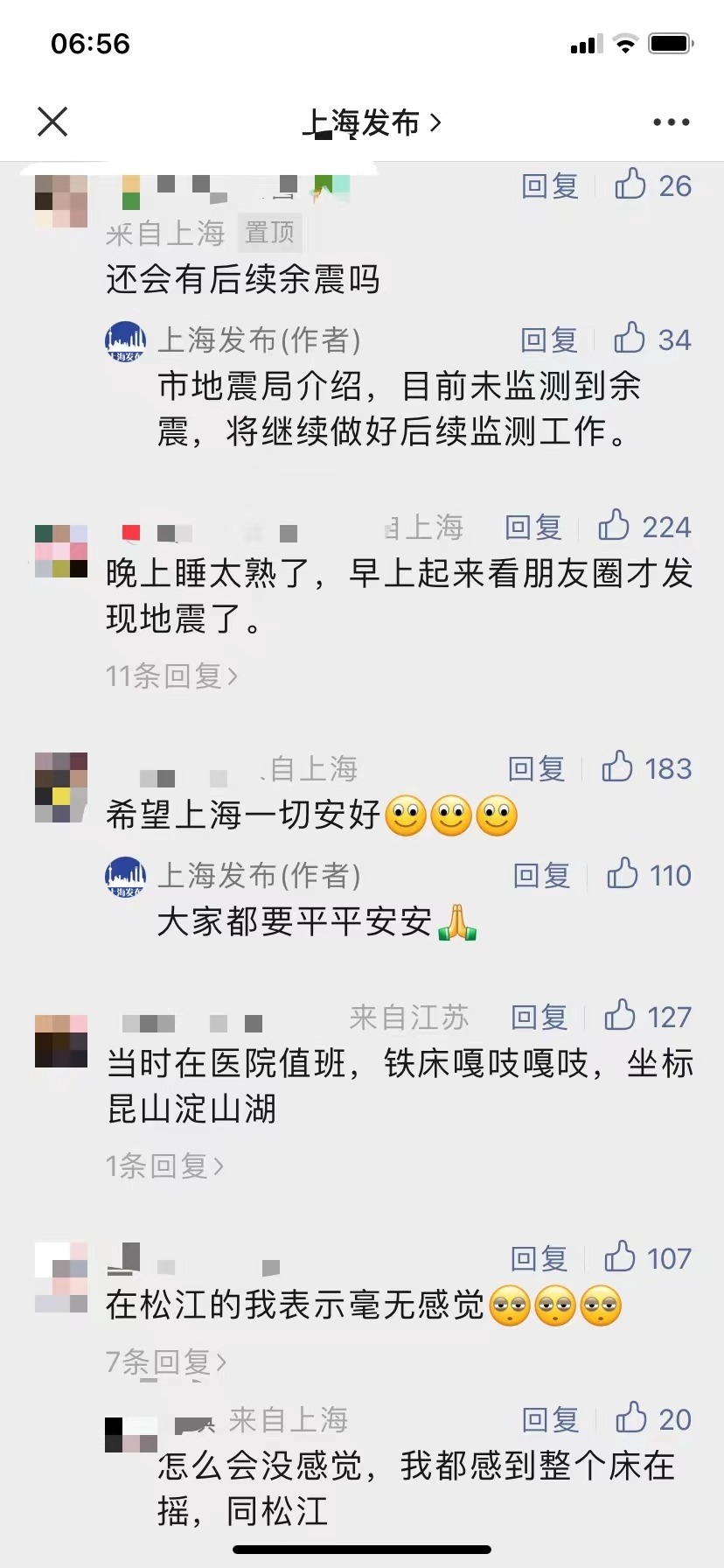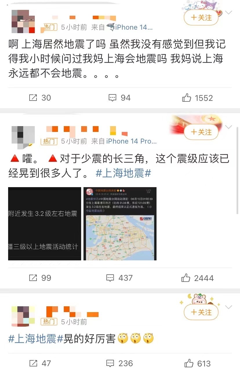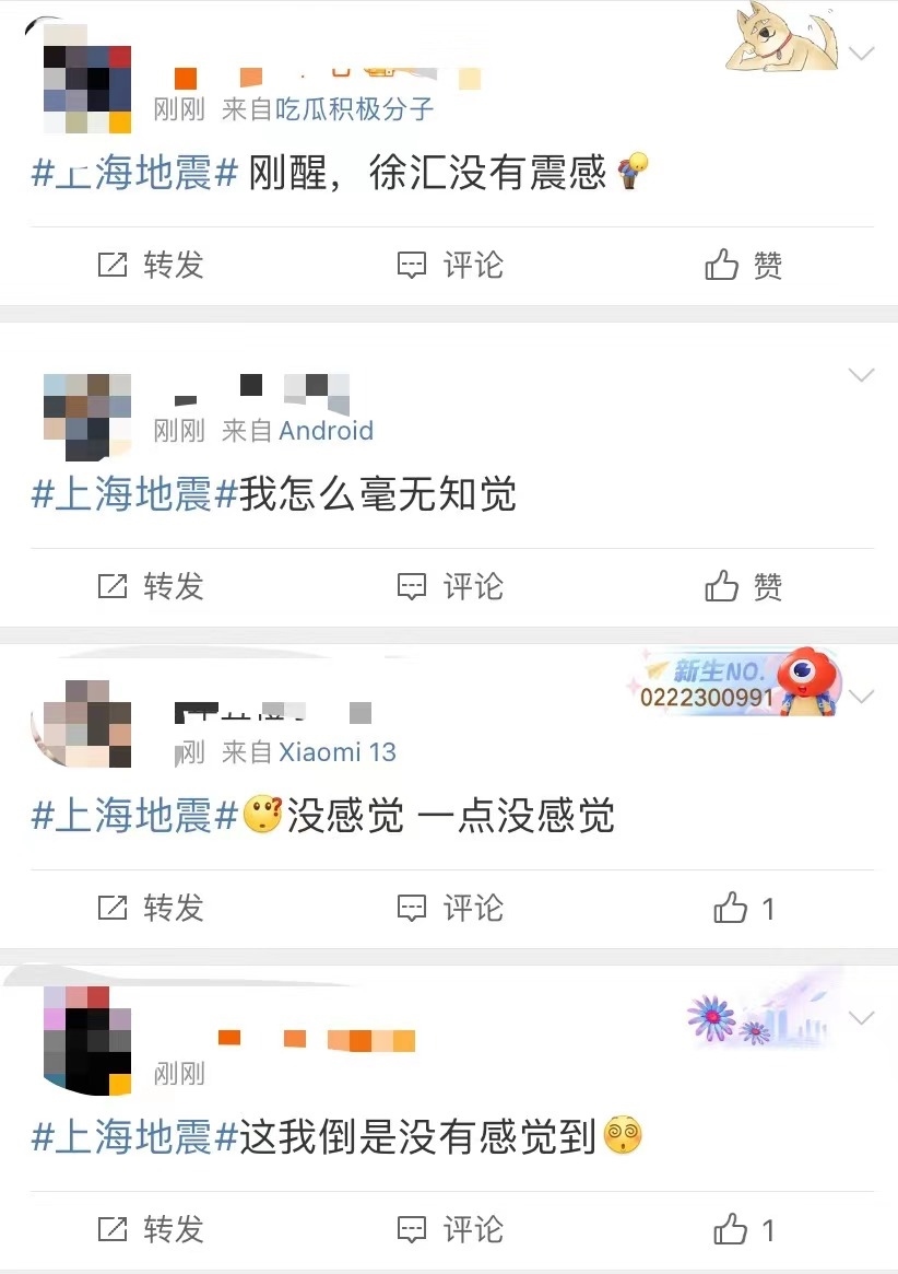 有網(wǎng)友表示,“床明顯在晃動(dòng)”“持續(xù)了四五秒”“徐匯輕微有震感”,不過(guò)也有很多網(wǎng)友表示,“在睡夢(mèng)中完全沒(méi)有感覺(jué)到”。