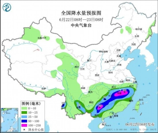 中央氣象臺6月22日06時繼續(xù)發(fā)布暴雨黃色預警:預計,6月22日08時至23日08時,貴州東南部、云南東部和西北部、廣西中部和東北部、廣東北部、湖南南部和東部、江西中北部、浙江南部、福建北部等地有大到暴雨,其中,廣西東北部、江西中部、福建西北部等地部分地區(qū)有大暴雨(100~200毫米)。上述部分地區(qū)有短時強降水(最大小時降雨量40~60毫米,局地可超過80毫米),局地伴有雷暴大風等強對流天氣(見圖1)。