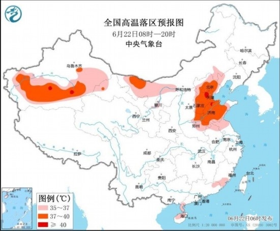 圖2 全國高溫落區(qū)預報(6月22日08時-20時) 圖自中央氣象臺網(wǎng)站
