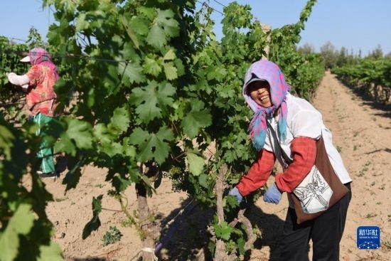 6月21日,在河北省懷來(lái)縣長(zhǎng)城桑干酒莊葡萄種植基地,當(dāng)?shù)剞r(nóng)民在田間勞作。