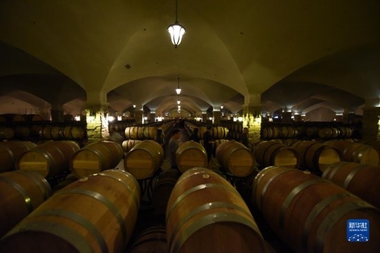 6月21日,在河北省懷來(lái)縣長(zhǎng)城桑干酒莊,游客在葡萄酒庫(kù)中參觀。