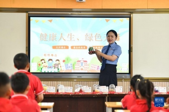 6月25日,民警在貴州省安順市禁毒宣傳教育基地為學(xué)生講解毒品相關(guān)知識。
