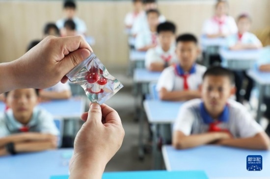 6月25日,在河北省唐山市豐潤區(qū)姜家營鎮(zhèn)楊家鋪小學(xué),民警為學(xué)生講解毒品危害。