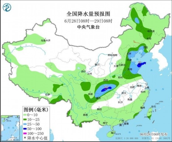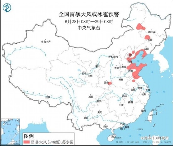 預(yù)計(jì),6月28日08時(shí)至29日08時(shí),遼東半島、北京東部、天津北部、河北東北部、山東中東部、四川東部、陜西南部、重慶大部、湖北西部等地部分地區(qū)有大到暴雨,其中,重慶北部局地有大暴雨(100~140毫米)。上述部分地區(qū)伴有短時(shí)強(qiáng)降水(最大小時(shí)降雨量30~50毫米,局地可超過(guò)60毫米),內(nèi)蒙古東北部、黑龍江西南部、吉林中西部、遼寧南部、陜西東南部、河北東部、北京東部、天津、山東北部和東部、安徽北部、江蘇北部等地的部分地區(qū)將有8~10級(jí)雷暴大風(fēng)或冰雹天氣,局地風(fēng)力可達(dá)11級(jí)(見圖1和圖2)。中央氣象臺(tái)6月28日06時(shí)繼續(xù)發(fā)布暴雨藍(lán)色預(yù)警和強(qiáng)對(duì)流天氣藍(lán)色預(yù)警。