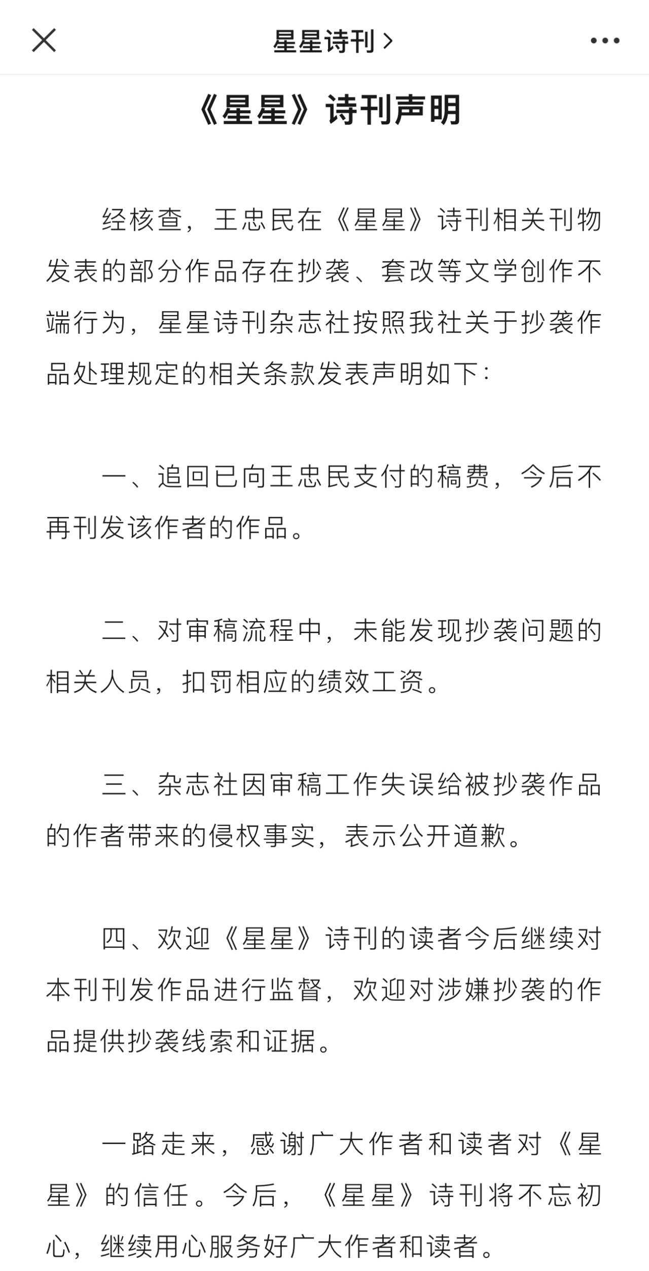 《星星》詩(shī)刊雜志社稱,按照該社關(guān)于抄襲作品處理規(guī)定的相關(guān)條款,追回已向王忠民支付的稿費(fèi),今后不再刊發(fā)該作者的作品;對(duì)審稿流程中,未能發(fā)現(xiàn)抄襲問(wèn)題的相關(guān)人員,扣罰相應(yīng)的績(jī)效工資。