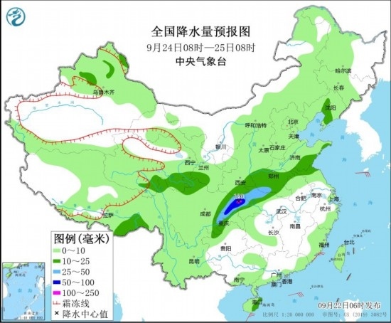 全國降水量預(yù)報圖(9月22日08時-23日08時)。圖片來源:中央氣象臺網(wǎng)站