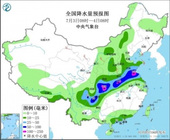全國(guó)降水量預(yù)報(bào)圖(7月3日08時(shí)-4日08時(shí))。圖片來(lái)源:中央氣象臺(tái)網(wǎng)站