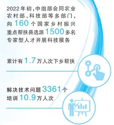 2022年初,中組部會(huì)同農(nóng)業(yè)農(nóng)村部、科技部等多部門(mén),以“一縣一團(tuán)”方式,向160個(gè)國(guó)家鄉(xiāng)村振興重點(diǎn)幫扶縣選派1500多名專(zhuān)家型科技支撐人才,精準(zhǔn)開(kāi)展科技服務(wù)和人才培養(yǎng)幫帶。