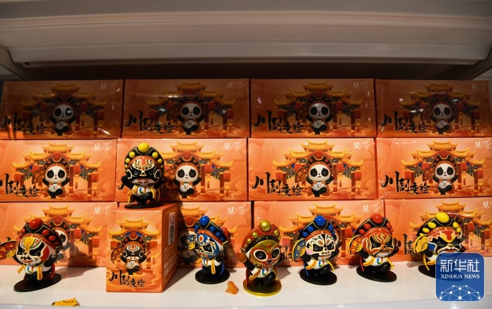 ↑這是7月13日拍攝的成都大運會主媒體中心大運會官方特許商品零售店展出的“蓉寶”川劇變臉造型玩偶。新華社記者 王曦 攝