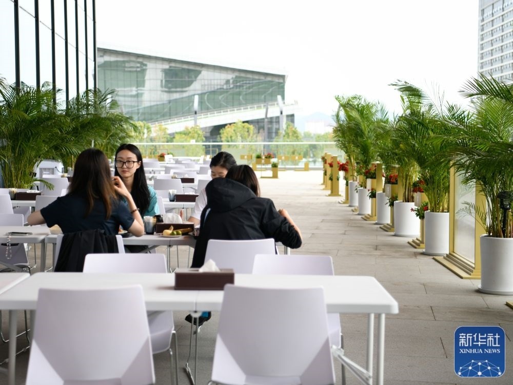 ↑7月14日,工作人員在成都大運會主媒體中心媒體餐廳室外就餐區(qū)就餐。新華社記者 胥冰潔 攝
