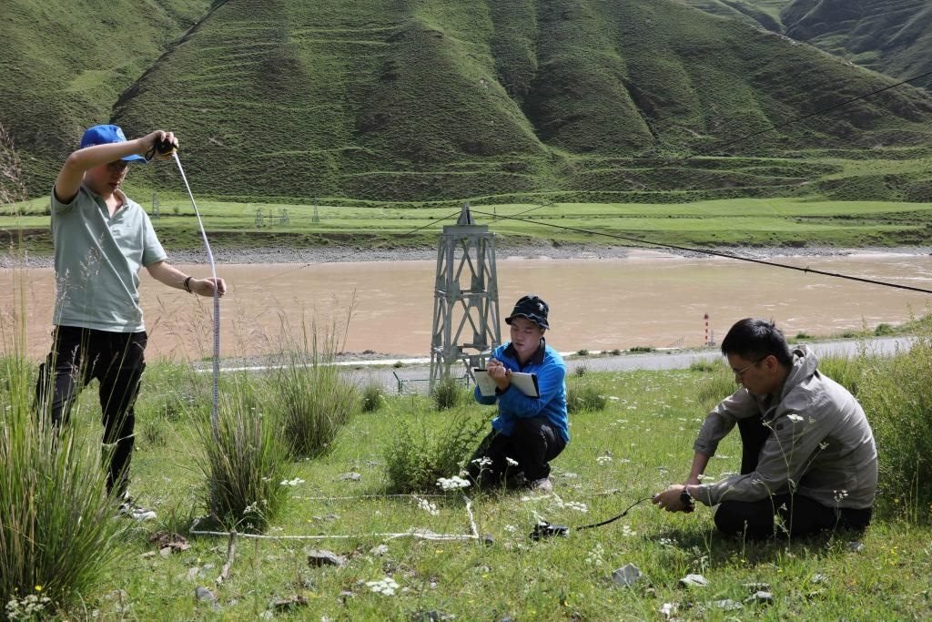 7月22日,長江科學院水土保持研究所的科考隊員在通天河直門達河段進行植被樣方調查。新華社記者劉詩平攝