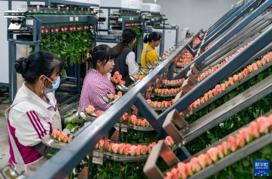 在云天化晉寧花卉產(chǎn)業(yè)現(xiàn)代化示范園內(nèi),花農(nóng)們將預(yù)冷處理后的鮮花放入自動分揀流水線(7月12日攝)。新華社記者 崔文 攝