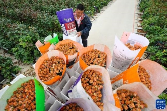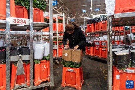 在云天化晉寧花卉產(chǎn)業(yè)現(xiàn)代化示范園內(nèi),花農(nóng)對鮮花進行簡單打包(7月12日攝)。新華社記者 陳欣波 攝