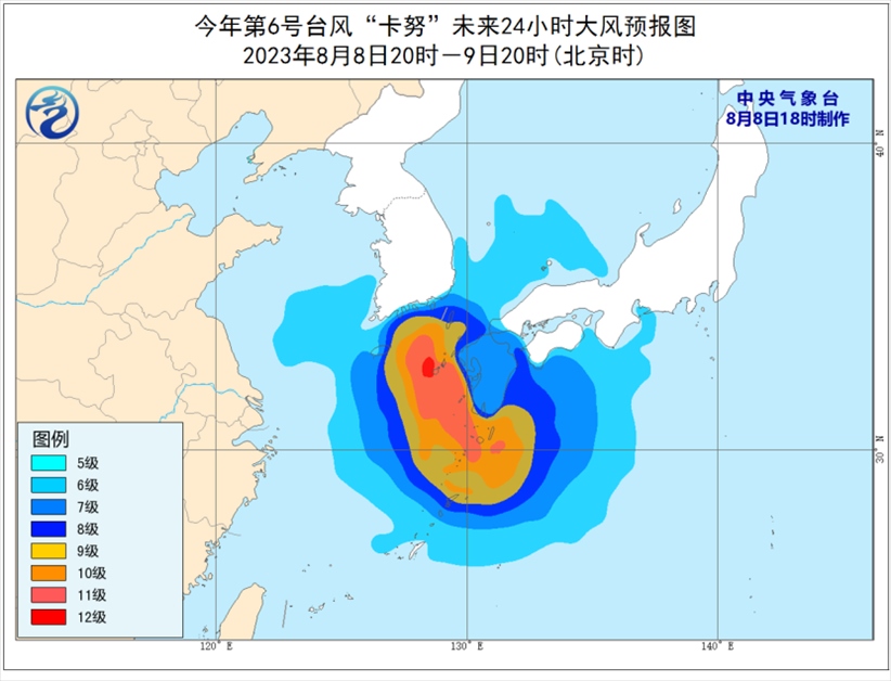 受“卡努”影響,8月8日至9日,巴士海峽、臺灣海峽北部、臺灣以東洋面、東海南部和東部及釣魚島附近海域有6級至7級大風,東海東部部分海域風力可達8級至10級,“卡努”中心經(jīng)過的附近海域風力可達11級至12級,陣風13級至14級。
