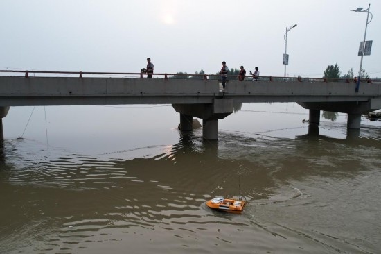 海委水文局水文應急監(jiān)測小分隊在大清河上測流作業(yè)。新華社記者 劉詩平 攝