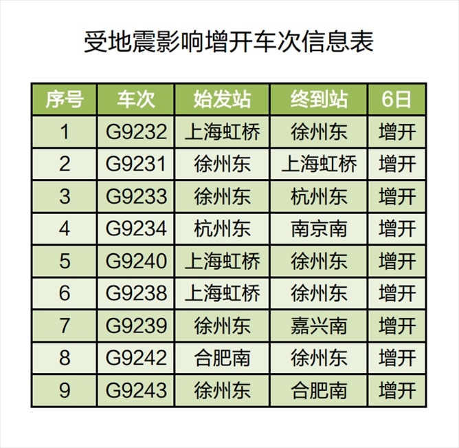 央視網(wǎng)消息:據(jù)長三角鐵路微信公眾號6日消息,受8月6日山東省德州市平原縣發(fā)生5.5級地震影響,為確保列車運(yùn)行安全,鐵路部門計(jì)劃對途經(jīng)京滬高鐵部分列車采取限速、停運(yùn)等措施;同時,根據(jù)旅客出行需要,計(jì)劃增開途經(jīng)京滬高鐵長三角管內(nèi)區(qū)段部分列車,滿足管內(nèi)旅客出行需要。截至當(dāng)日11時30分,計(jì)劃停運(yùn)92趟列車、增開9趟列車。
