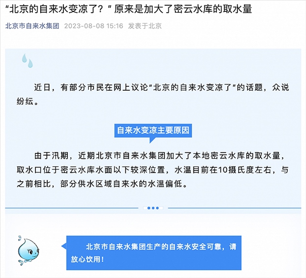 央視網(wǎng)消息:近日,有部分市民在網(wǎng)上議論“北京的自來(lái)水變涼了”的話題。北京市自來(lái)水集團(tuán)8月8日通過(guò)其公眾號(hào)回應(yīng),由于汛期,近期北京市自來(lái)水集團(tuán)加大了本地密云水庫(kù)的取水量,取水口位于密云水庫(kù)水面以下較深位置,水溫目前在10攝氏度左右,與之前相比,部分供水區(qū)域自來(lái)水的水溫偏低。