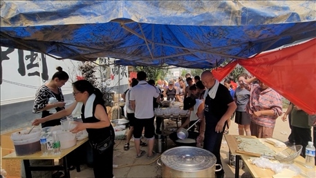在涿州市刁窩鎮(zhèn)西茨村臨時飯點,村民們排隊領取飯菜。新華社記者蘇凱洋 攝