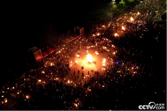 2023年8月10日,云南楚雄舉行中國·楚雄2023年彝族火把節(jié)活動(dòng),游客與當(dāng)?shù)孛癖娨黄饸g慶火把節(jié)。
