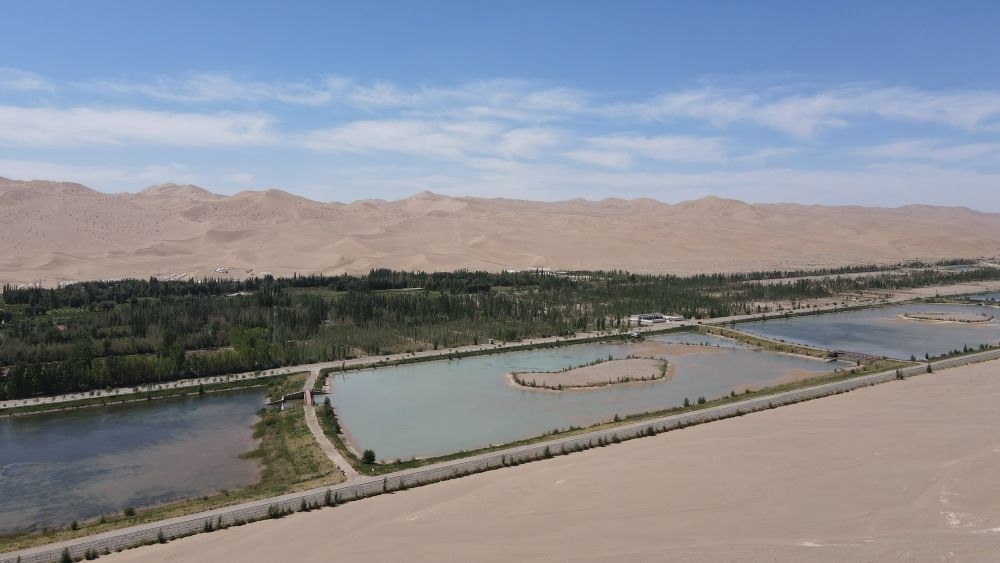 在距離月牙泉5公里的地方,有一處人稱“十二連湖”的景觀。十二個(gè)人工水池宛若明鏡,倒映藍(lán)天,時(shí)有水鳥(niǎo)掠過(guò)。