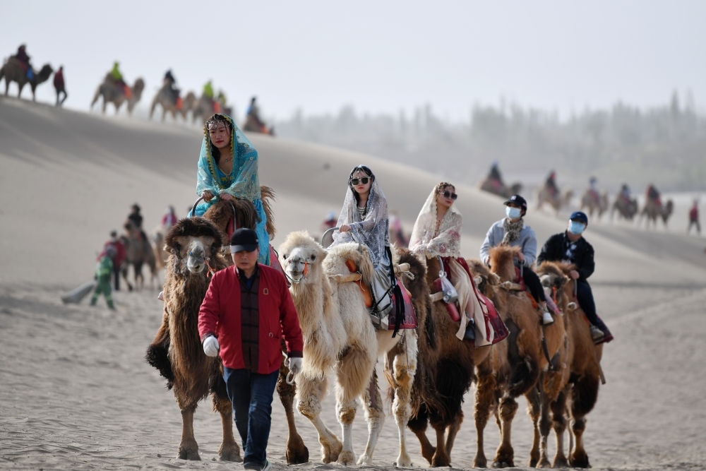 駝隊(duì)載著游客行走在鳴沙山月牙泉景區(qū)的駝道上(2023年4月24日攝)。新華社記者 陳斌 攝