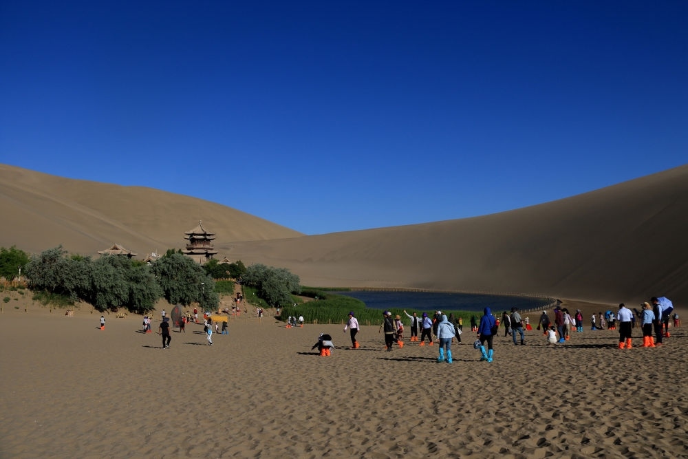 從敦煌市區(qū)出發(fā),向南行走5公里,就到了鳴沙山下。起伏黃沙勾勒出一道道利落的曲線,三面沙山環(huán)抱,突現(xiàn)一泓月牙形狀的清泉,水波蕩漾,魚(yú)翔淺底。