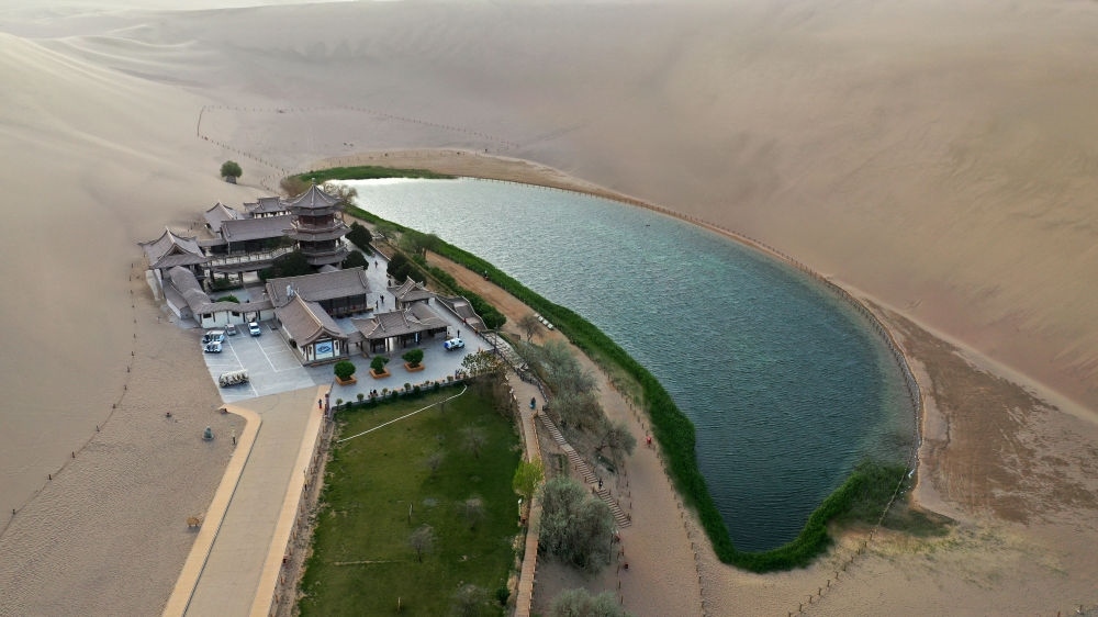 這是敦煌鳴沙山北麓的月牙泉(2023年4月24日攝,無(wú)人機(jī)照片)。新華社記者 陳斌 攝