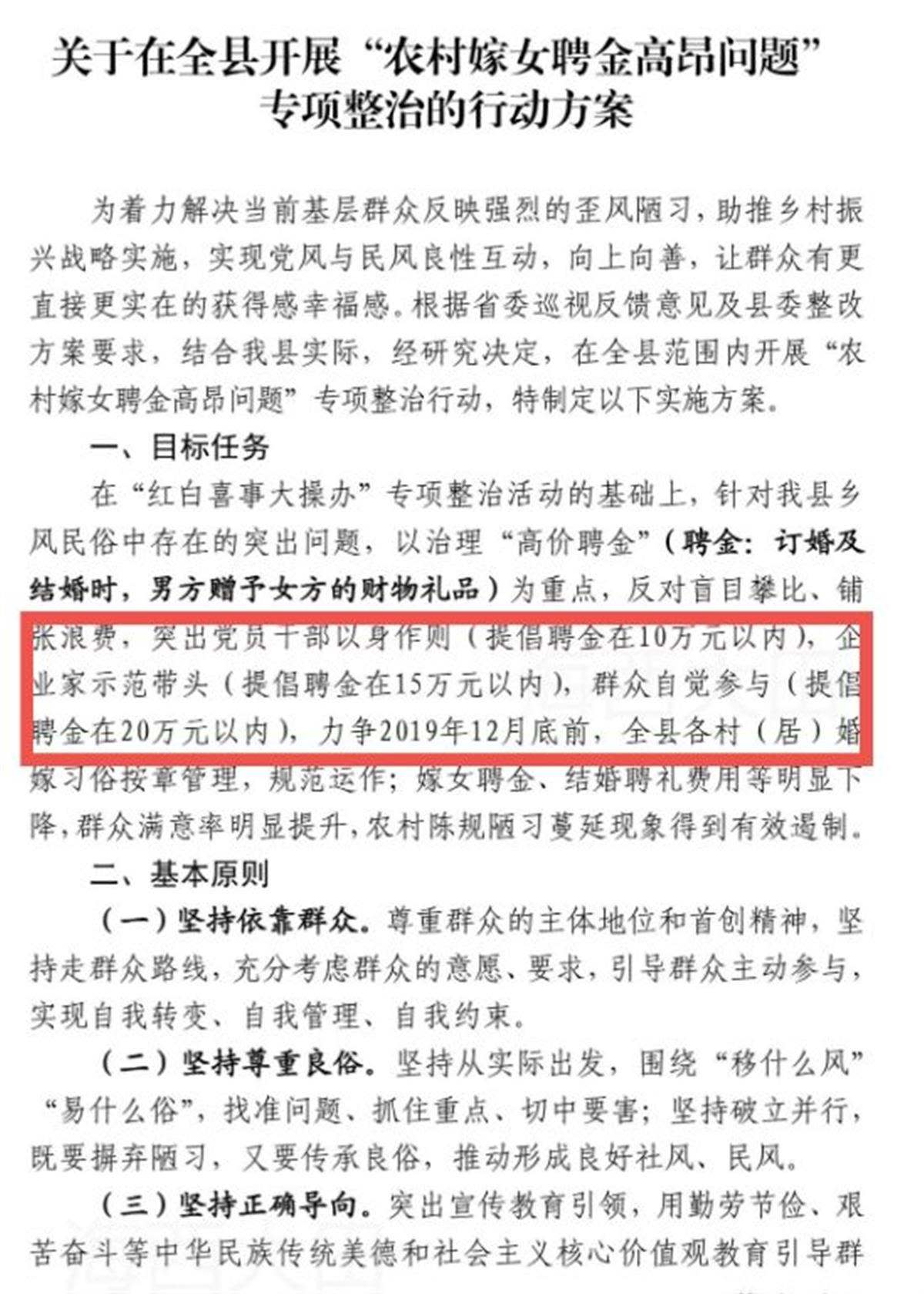 2019年5月,大田縣委辦公室就印發(fā)《關(guān)于在全縣開展“農(nóng)村嫁女聘金高昂?jiǎn)栴}”專項(xiàng)整治的行動(dòng)方案》的通知。方案內(nèi)容有,針對(duì)該縣鄉(xiāng)風(fēng)民俗中存在的突出問(wèn)題,以治理“高價(jià)聘金”為重點(diǎn),反對(duì)盲目攀比、鋪張浪費(fèi),突出黨員干部以身作則(提倡聘金在10萬(wàn)元以內(nèi)),企業(yè)家示范帶頭(提倡聘金在15萬(wàn)元以內(nèi)),群眾自覺(jué)參與(提倡聘金在20萬(wàn)元以內(nèi)),力爭(zhēng)在2019年12月底前,結(jié)婚聘禮費(fèi)用等明顯下降。