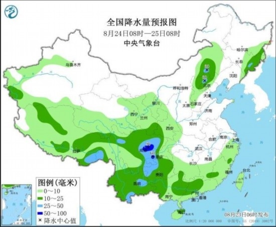 中新網(wǎng)8月24日電 據(jù)中央氣象臺網(wǎng)站消息,預計,8月24日至27日,四川盆地、陜西南部、山西中南部、河南、湖北等地有大到暴雨,部分地區(qū)有大暴雨。此外,24日08時至25日08時,內(nèi)蒙古中東部、吉林東部、河北東部、山東西北部、川西高原、四川盆地中西部、貴州大部、云南大部、廣西西部和東南部、廣東、海南島及西藏東南部等地的部分地區(qū)有中到大雨,局地有暴雨。