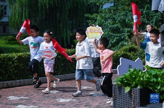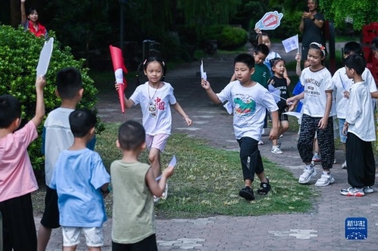 8月24日,在湖州市龍泉街道白魚(yú)潭社區(qū),孩子們拿著自己制作的火炬,參與趣味火炬?zhèn)鬟f活動(dòng)。