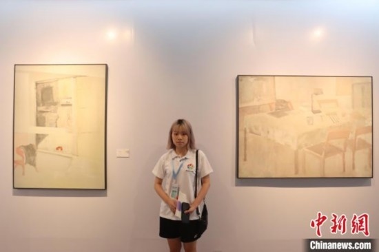 8月26日下午,廣東省廣州市,粵臺學子中華情——2023兩岸大學生文化藝術(shù)夏令營啟動儀式暨“融·合”兩岸大學生藝術(shù)交流展開幕式在廣東華僑博物館舉行。圖為臺灣學生在兩岸大學生藝術(shù)交流展作品前留影。吳善基攝