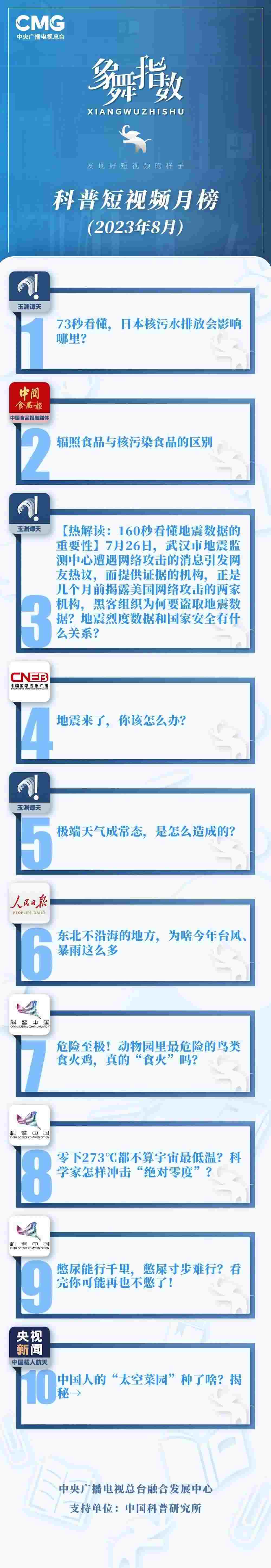 中央廣播電視總臺“象舞指數(shù)”評議品牌,推出科普短視頻月榜、總臺科普短視頻月榜。在2023年8月,值得注目的內(nèi)容有: