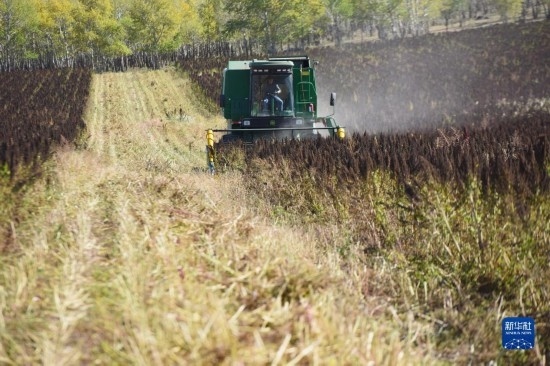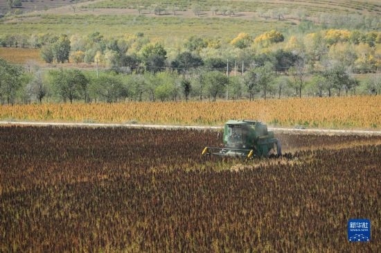 10月1日,在沽源縣白土窯鄉(xiāng)小西溝村,當(dāng)?shù)剞r(nóng)機(jī)手王永成在操作收割機(jī)收獲藜麥。