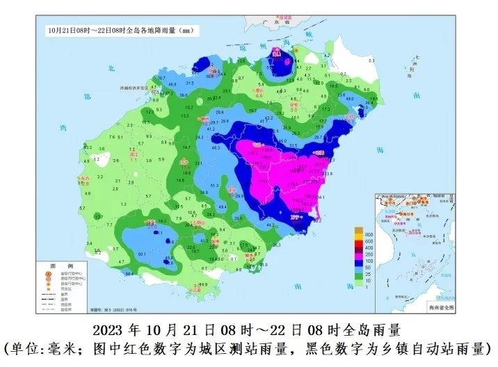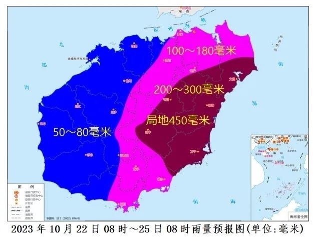 預(yù)計(jì),10月22日08時(shí)~25日08時(shí)各地累積雨量:文昌、瓊海、瓊中、屯昌和萬寧200~300毫米、局地450毫米,???、澄邁、定安、保亭、陵水和三亞100~180毫米,其余市縣50~80毫米。