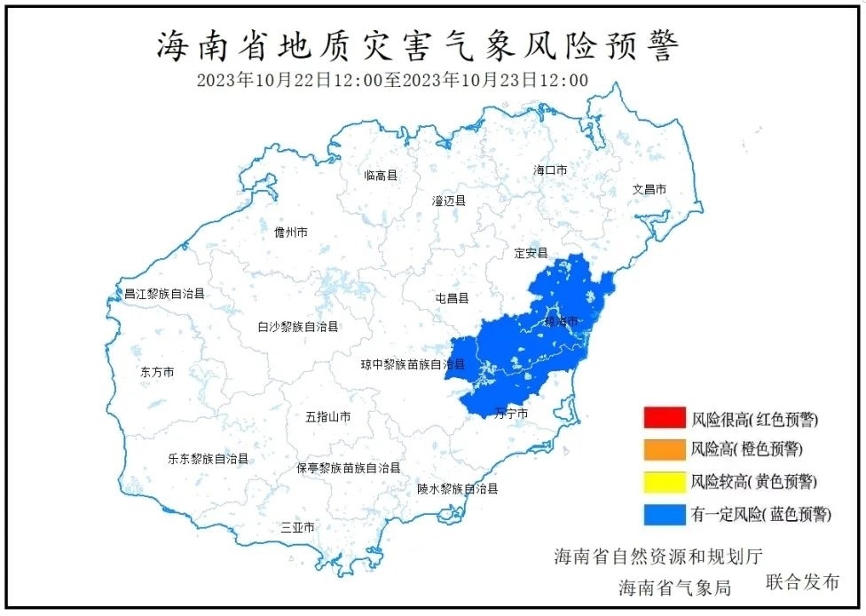 海南省自然資源和規(guī)劃廳、海南省氣象局2023年10月22日10時(shí)聯(lián)合發(fā)布地質(zhì)災(zāi)害氣象風(fēng)險(xiǎn)預(yù)警:根據(jù)海南省氣象臺(tái)前期降雨實(shí)況和未來24小時(shí)降雨預(yù)報(bào),預(yù)計(jì)未來24小時(shí)(2023年10月22日12:00-10月23日12:00)瓊海市全境,萬寧市龍滾鎮(zhèn)、三更羅鎮(zhèn)、北大鎮(zhèn),瓊中縣中平鎮(zhèn)降雨誘發(fā)地質(zhì)災(zāi)害有一定風(fēng)險(xiǎn),為Ⅳ級(jí)風(fēng)險(xiǎn)預(yù)警(藍(lán)色預(yù)警)。請(qǐng)上述市縣、鄉(xiāng)鎮(zhèn)政府及有關(guān)部門做好地質(zhì)災(zāi)害防御工作。