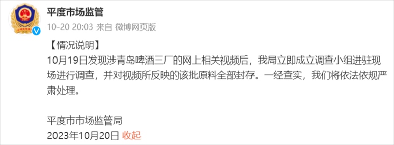 《每日經(jīng)濟新聞》記者注意到,青島啤酒三廠所在地的平度市市場監(jiān)管局也發(fā)布情況說明稱,10月19日發(fā)現(xiàn)涉青島啤酒三廠的網(wǎng)上相關(guān)視頻后,我局立即成立調(diào)查小組進駐現(xiàn)場進行調(diào)查,并對視頻所反映的該批原料全部封存。“一經(jīng)查實,我們將依法依規(guī)嚴肅處理?!?/p>