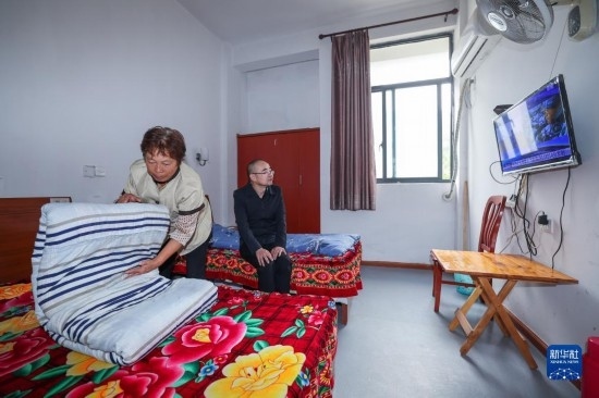10月26日,工作人員在杭州市富陽(yáng)區(qū)湖源鄉(xiāng)居家養(yǎng)老服務(wù)中心為老年人整理床鋪。