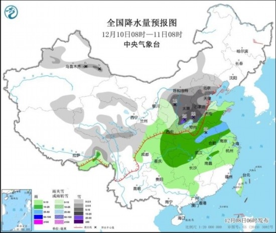 12月10日08時至11日08時,新疆沿天山地區(qū)和伊犁河谷、內(nèi)蒙古河套地區(qū)、西藏北部和東部、川西高原北部、西北地區(qū)中部和東北部、華北、黃淮北部等地部分地區(qū)有小到中雪或雨夾雪,其中,新疆沿天山地區(qū)、陜西北部、山西中南部、河北中南部、北京西南部、天津南部、山東西北部、河南北部等地部分地區(qū)有大到暴雪或雨夾雪,局地大暴雪(20~22毫米)。西北地區(qū)東南部、黃淮中南部、江淮、江漢、江南大部、西南地區(qū)東部、華南北部、臺灣島等地部分地區(qū)有小到中雨,其中,河南南部和西部、安徽北部、江蘇北部、湖北北部等地部分地區(qū)有大雨(25~35毫米)。黑龍江東北部部分地區(qū)有4~6級風(fēng)。