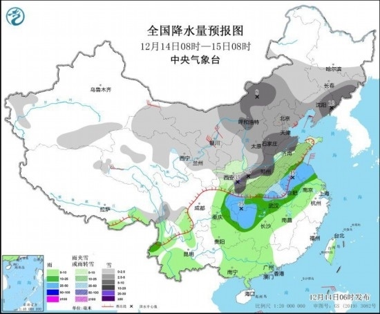 12月14日08時至15日08時,西北地區(qū)中東部、內(nèi)蒙古中西部和東南部、吉林、遼寧、華北、黃淮大部、江淮西部、湖北北部等地部分地區(qū)有小到中雪或雨夾雪,其中,內(nèi)蒙古中部、吉林東南部、遼寧東部、陜西東南部、湖北西北部、河南大部、安徽北部、山東中西部、河北南部等地部分地區(qū)有大到暴雪,陜西秦嶺東部、湖北西北部、河南西部山區(qū)等地局地有大暴雪或特大暴雪(30~35毫米)。江淮東部、江漢大部、江南北部和西部、重慶等地部分地區(qū)有中到大雨。內(nèi)蒙古西部、甘肅河西等地部分地區(qū)有4~6級風。