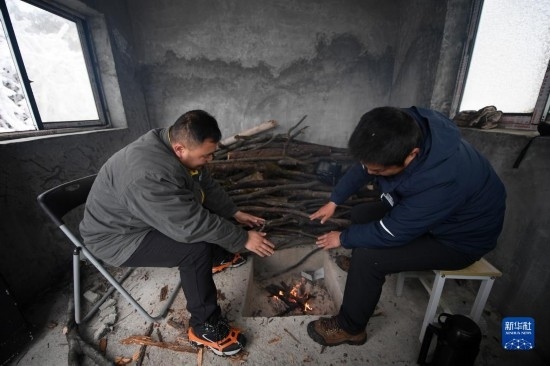 12月19日,尹斌(右)和龍昱君在110千伏西公線003號(hào)監(jiān)測哨所休息。這座水泥小屋在2020年修建,以便輸電運(yùn)檢工觀測融冰時(shí)休息。