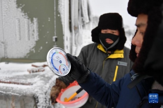 12月19日,尹斌(右)和龍昱君前往110千伏西公線003號(hào)監(jiān)測哨所觀測冰情。