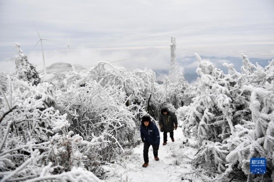 12月19日,尹斌(右)和龍昱君在110千伏西公線003號(hào)監(jiān)測哨所觀測鐵塔覆冰情況后返回。