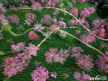 2023年12月18日,云南大理,無量山櫻花谷的冬櫻花迎來最佳觀賞期。如云似霞的櫻花與碧綠如染的茶園交織在一起,構(gòu)成了一道亮麗的風(fēng)景。