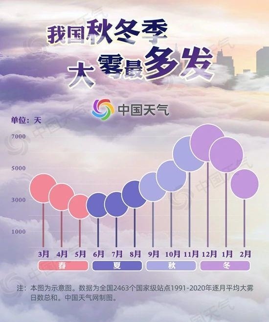 從逐月數(shù)據(jù)來看,常年我國(guó)大霧日數(shù)最多的月份是12月,其次是11月和1月,最少的月份是5月。這是因?yàn)槲覈?guó)內(nèi)陸地區(qū)的大霧種類主要是輻射霧。秋冬季節(jié),夜晚較長(zhǎng)、氣溫較低,夜間地面輻射冷卻,容易使地面大氣中水汽凝結(jié),從而形成輻射霧。