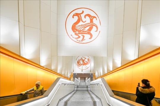 17號線太陽宮站里,仿佛照射進(jìn)太陽金光,站廳里的暖陽壁畫、上下扶梯時(shí)墻壁上的神鳥瓦當(dāng),都有不少乘客舉著手機(jī)拍照。