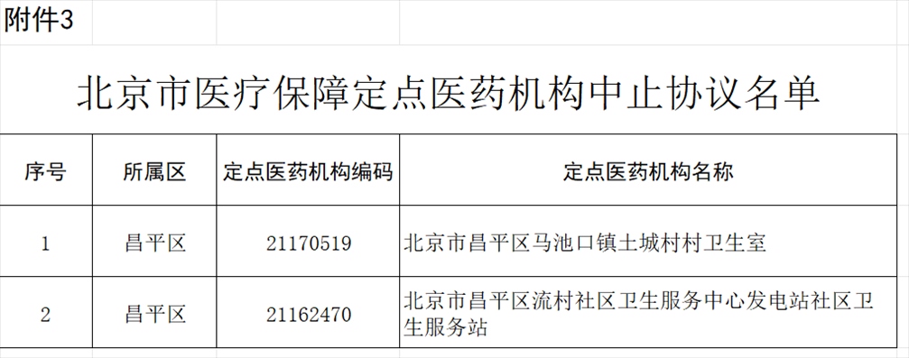 北京市昌平區(qū)馬池口鎮(zhèn)土城村村衛(wèi)生室等2家定點醫(yī)藥機構因不能繼續(xù)為參保人員提供服務,申請中止協(xié)議,經市、區(qū)醫(yī)保經辦機構審核,現決定對上述2家定點醫(yī)藥機構中止協(xié)議(見附件3)。