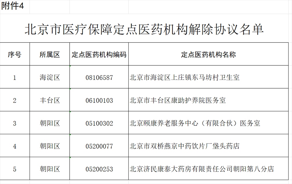 北京市海淀區(qū)上莊鎮(zhèn)東馬坊村衛(wèi)生室等5家定點醫(yī)藥機構因已注銷,申請解除協(xié)議。經市、區(qū)醫(yī)保經辦機構審核,對上述5家定點醫(yī)藥機構解除協(xié)議(見附件4)。