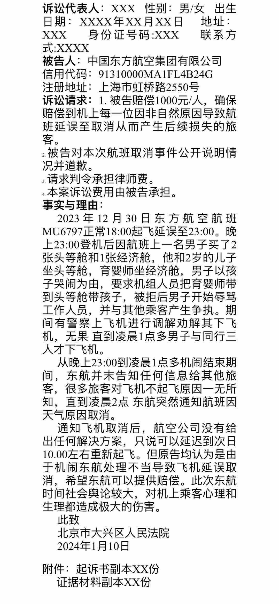 群內(nèi)發(fā)出的起訴書寫道:“從當(dāng)日23點到次日凌晨1點多機(jī)鬧結(jié)束期間,東航并未告知任何信息給其他旅客,很多旅客對飛機(jī)不起飛原因一無所知,直到凌晨2點,東航突然通知航班因天氣原因取消。通知飛機(jī)取消后,航空公司沒有給出任何解決方案,只說可以延遲到次日10點左右重新起飛。但原告均認(rèn)為是由于機(jī)鬧,東航處理不當(dāng),導(dǎo)致飛機(jī)延誤取消,希望東航可以提供賠償。此次東航事件社會輿論較大,對機(jī)上乘客心理和生理都造成極大的傷害?!睋?jù)悉,乘客們擬起訴至北京市大興區(qū)人民法院。